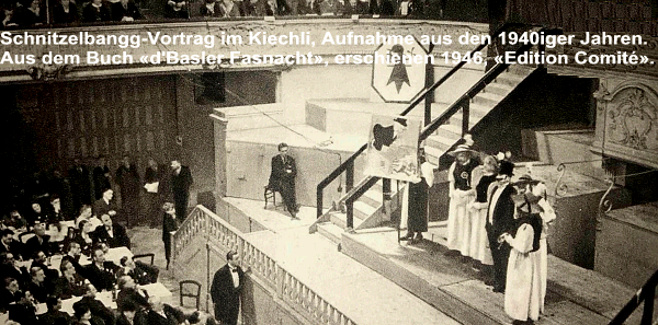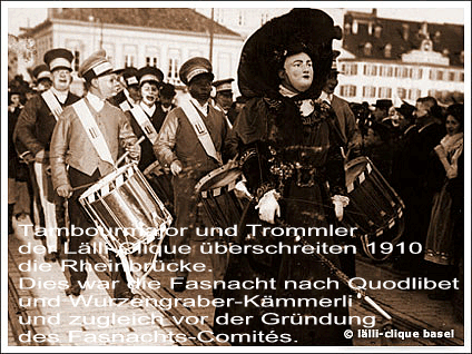 In den Anfangsjahren des Monstre waren nur Trommel- oder Blasmusikvorträge oder zu hören, keine Pfeifer und keine Rahmenstücke. Die National-Zeitung schrieb: Schon lange vor I Uhr war die Halle gepfropft voll, wie sich übrigens voraussehen liess und noch immer wollte sich ein Menschenstrom von beängstigender Wucht Einlass verschaffen. Die Leute harrten in den Gängen und sogar im nassen Garten wacker aus. Noch nie war die Jungmannschaft so zahlreich zugegen wie bei diesem Anlass, aber auch alle alten Trommel- und Fasnachtskoryphäen Basels waren erschienen. Von 1907 - 1910 fanden die Konzerte in der Burgvogtei, am Montag vor Aschermittwoch statt. In dieser Zeit tauchen auch die Waisenknaben im Programm auf. Am Monstre 1910 wurden Einnahmen von Fr. 1'406.20 registriert, davon hat das Comité Fr.764.40 als Gage an die Mitwirkenden ausgeschüttet. Anno 1911 zügelte das Monstre in den Musiksaal vom Stadtcasino, das Patronat lag nun beim neu gegründeten Fasnachts-Comité. Ab 1914 diente das Küchlin-Theater (damals noch ein Variet6)als Aufführungsort. Es ist zum ersten Mal von einem Prolog die Rede. Für die Saalmiete mussten Fr. 600.- bezahlt werden. Das Marschrepertoire war mit 12 Märschen bescheiden und reichte nicht für die 18 auftretenden Gesellschaften. Das Fasnachts-Comité entschuldigte sich regelmässig für die Wiederholungen. In den Kriegsjahren 1915 und 1916 waren die Vorstellungen sehr stark von Patriotismus geprägt und manch ein Rahmenstück geriet zum Heldenepos. Ab 1918 fanden 2 Vorstellungen statt. Aus dem Prolog von 1919: De kenntsch de Easler s Wrtshuus, d Fraue ewäggnää, d Läggerli am Aend, de kenntsch ene dr Kopf abhaue so drummle halt elai no d Händ. ln den Jahren 1920 - 1922 ist zum ersten Malvon Rahmenstiggli die Rede. Man kam auch davon ab, am Schluss der Vorstellung alle Tambouren und Pfeifer noch einmal zusammen auftreten zu lassen, es waren deren zu viele. 1926 wurden neu 3 Vorstellungen angeboten. Sie waren alle ausverkauft. ln einem Protokoll des Fasnachts-Comités von 1934 kann nachgelesen werden: Das Rahmenspiel von Dr' Bohny ist fast fertig. Einem früheren Wunsch zufolge(Beteiligung von Frauen) wird eine Girlstruppe von A. Fromm teilnehmen. 1940 - 1945 ln den Jahren des 2. Weltkriegs, während dessen Dauer keine Strassenfasnacht stattfand, tauchen die Namen Dipflischysser und Haimlifaiss im Rahmenprogramm auf. Ein regelmässig, bis Ende der 50-er Jahre wiederkehrender 2 Personen-Auftritt, deigrosse Erfolge feierte und auf einem der ersten Drummeli-Tonträger noch zu hören ist. 1947 beschliesst eine Delegiertenversammlung der Cliquen, dass das gesprochene Worte nur durch die Rahmenspieler erfolgen soll. Ab 1948 werden die Billette für die 8 Vorstellungen an 10 Schaltern der Mustermesse verkauft. Die Kauflustigen stehen stundenlang Schlange, sämtliche Vorstellungen sind ausverkauft. Sie finden über 2 Wochenenden jeweils nachmittags und abends statt. 1956 kommt eine weitere Vorstellung dazu. Die Balkonszene mit dem Ehepaar Herr und Frau Dr. Gläppersämi, em Frailain Glepfgafter und dr Frau Hibsch beginnt Furore zu machen. Seit 1962 können nicht mehr alle Stammcliquen im gleichen Jahr am Monstre teilnehmen, ein Teil muss pausieren. Seit einigen Jahren bleibt die Zahl der Stammvereine konstant, so dass sich alle im Zweijahresrhythmus einmal auf der Drummeli-Bühne präsentieren können. 1993 - 2010 finden die Monstre Trommelkonzerte im Festsaal der Messe Basel statt. Ab 2011 ist das Musical Theater der fünfte Spielort des Drummeli. Dann im 2022 der Ausrutscher zurück ins Küchlin, es blieb dabei, die Bühne gibt nicht das her, was das Drummeli braucht um als Das Drummeli daher zukommen! Ab dem 2023 ist das Drummeli in der Eventhalle der Messe Basel angekommen, wo es hoffentlich ein paar Jahre bleiben kann? Zurück auf die Seite weiterer Vorfasnachts-Vorboten! |