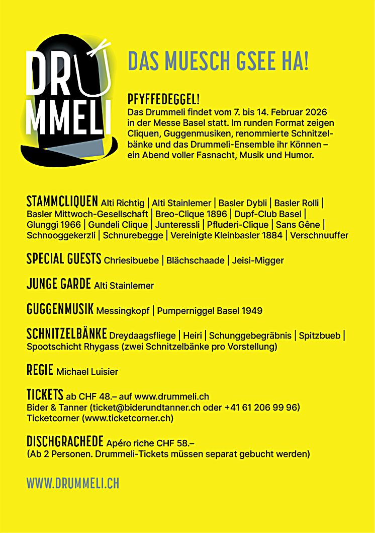 Was interessiert Di? Gligg uff die Zyyle! S'Neuschte vom Drummeli 2026 wieder in der Eventhalle der Messe Basel! Im 2025 wie immene Zirkus, ess lauft eppis in dr Mitti, de hoggsch drumume! Lueg aifach emoole ine! Videos: Geschichten vom Drummeli Was sind deine Erinnerungen ans Drummeli? Diese Frage haben wir verschiedenen Personen gestellt. In kurzen Clips erzählen sie, was das Drummeli für sie bedeutet. Acht Videos (u.a. mit Susanne Hueber, Yannick Amherd, Stephanie Eymann und -minu) !£ findest du auf unseren Kanälen wie Youtube, Instagram oder Facebook. Wie kam es dazu, dass das Drummeli im 2022 wieder im Kiechli stattfand? Das Geschichtliche vom Drummeli was ab 1907 bis Heute passierte... Drummeli 2026: Pfyffedeggel – das muesch gseh ha! Liebe Freundinnen und Freunde vom Drummeli Das Drummeli 2026 findet vom 7. bis 14. Februar 2026 in der Event Halle der Messe Basel statt und wird erneut im runden Format gespielt. 16 Stammcliquen, zwei Guggemusiken, renommierte Schnitzelbänke, Gastformationen und ein vielseitiges Schauspielensemble sorgen für die perfekte Einstimmung auf die Fasnacht. Vorstellungen und Vorverkauf Das Drummeli 2026 feiert am 7. Februar Première und umfasst insgesamt sieben Vorstellungen. Die Dernière wird am Samstagabend, 14. Februar stattfinden. Der offizielle Ticket-Vorverkauf startet heute Donnerstag, 13. November 2025 startet und so wie immer bei Bider & Tanner. Tickets sind ab CHF 48.– erhältlich. Konzept und Motto Das Motto des Drummeli 2026 lautet «Pfyffedeggel» – Jetzt erscht rächt! Ein baseldeutsches Wort, das Trotzigkeit, Gelassenheit und Humor zugleich ausdrückt. Unter der künstlerischen Leitung von Michael Luisier entsteht eine Inszenierung, die erneut Tradition und Gegenwart miteinander verbindet. «Dabei geht es auch darum, sich vom momentanen Zeitgeschehen nicht unterkriegen zu lassen, sondern ihm etwas Trotziges und Freudvolles entgegenzusetzen. Und sei es erst einmal nur mit einem alten baseldeutschen Wort wie Pfyffedeggel», sagt Regisseur Michael Luisier. Regie: Michael Luisier Mit der runden Arena-Bühne rückt das Drummeli erneut näher ans Publikum. Das Format bietet auch 2026 Raum für besonders kreative Umsetzungen der Cliquen-Auftritte. «Mit der 2025 eingeführten Arena-Bühne wurde eine neue Nähe zwischen Aktiven und Publikum geschaffen. Die Energie, die entsteht, wenn hunderte Fasnächtler gemeinsam auf der Bühne stehen, ist einzigartig. Eine Dynamik, wie man sie nur von der Fasnacht her kennt», ergänzt Matthieu Meyer, Produzent des Fasnachts-Comités. Saalplan Eventhalle Messe Basel Ensemble Zum Ensemble gehören wieder Jonathan Bötticher, Daniel Buser und Florian Volkmann, die bereits 2025 mit ihrer Sprachkunst und Musikalität begeistert haben. Nach einigen Jahren Pause kehrt Urs Bihler auf die Drummeli-Bühne zurück. Vielen Drummeli-Besucherinnen und -Besucher ist er durch seine markante Wortkunst in bester Erinnerung («Sage Si Epfel oder sage Si Öpfel?»). Neu im Ensemble sind zudem die erfahrenen Theaterprofis Sylvia Garatti und Sangita Singh. Bühne: Pascal Kottmann Musikalische Leitung: Florian Volkmann Produktionsleitung: Matthieu Meyer - Linda Atz - Roger Birrer Drummeli-Dischgrachede Die Drummeli-Dischgrachede (Baseldytsch für «reichhaltige Mahlzeit») in der Fiera Bar Basel umfasst einen Apéro riche vor der Vorstellung, ein Dessert in der Pause sowie einem gemütlichen Ausklang nach der Vorstellung. Die im Angebot enthaltenen Getränke sind in vordefinierter Anzahl verfügbar und können individuell vor, während oder nach der Vorstellung eingelöst werden. Dieses Arrangement bietet den idealen Rahmen für einen genussvollen und geselligen Abend. Die Dischgrachede ist ab zwei Personen buchbar und kostet CHF 58.– pro Person (ohne Vorstellungstickets). Bier-Dischgrachede (klassische oder vegetarische Variante): pro Person: 4 Bier, 5dl Wasser, 1 Kaffee oder Espresso Drummeli-Plättli, kleine herzhafte Köstlichkeiten, Süsses Wein-Dischgrachede (klassische oder vegetarische Variante): pro Person: 3 dl Wein, 5dl Wasser, 1 Kaffee oder Espresso Drummeli-Plättli, kleine herzhafte Köstlichkeiten, Süsses Ab 18.00h - Einlass über die Fiera Bar Beginn Drummeli: 19.30h In der Pause: Süsses und Kaffee Nach der Vorstellung: Ausklang in der Fiera Bar Emoole ineluege was me so über d'Fasnacht und übers'Drummeli so usssage duet! Ussschnitt vom Drummeli und anderi Biiträg, Gligg uff «Reels» und dene uff erschte Bild, denne kasch di duuregligge! Gligg uff d'Website vom Fasnachts-Comité lueg ine, denne waisch was s'Comité so z'Brichte hett! Kinder und Jugendliche (bis 16 Jahre) zahlen für die Sonntagsnachmittags-Vorstellung in allen Kategorien den halben Preis. s het, solang s het! Augen auf beim Ticketkauf! Zum Schutz vor überteuerten Tickets oder Fälschungen empfehlen wir dringend, Tickets nur über die durch uns autorisierten, offiziellen Vorverkaufsstellen zu kaufen und nie auf Websites von sogenannten Ticket-Zweitanbietern wie: Alltickets, Viagogo, Onlineticketshop, Worldticketshop, Vienna Ticketoffice, Ticketbande, Ebay, Ricardo und anderen mehr. S'näggscht Thema: Wie kam es dazu, dass jetzt das Drummeli im Musical Theater landete? Wie kam es dazu, dass jetzt das Drummeli im Musical Theater landete? Vom "Kiechli" in den Messesaal, vom Messesaal ins Musical-Theater. An jedem Ort bekommt das Drummeli eine andere Form: so entwickelte es sich mit dem Wechsel vom Kiechli in den Messesaal vom Vorfasnachtsvarieté zur gross angelegten Show im Musical- Theater wird es sich aufgrund der räumlichen Gegebenheiten von der Show zum unterhaltsamen Fasnachtstheater erneut weiterentwickeln. Auch am neuen Ort wird der 2009 eingeschlagene Weg fortgesetzt. Wieder soll ein "Drummeli aus einem Guss" entstehen; mit einem roten Faden, einem einheitlichen Raum- und Musikkonzept, durchgehenden Figuren und verbindenden Elementen zwischen Prolog, Raamestiggli und Schnitzelbankauftritten' Allerdings bedeutet der neue Spie